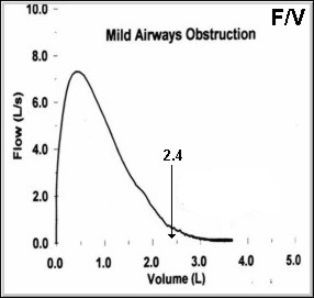 The loop (F/V curve) shows a good crisp start, early peaking, smooth downslope, and an acceptable end by approaching the baseline horizontally. Airways obstruction is suspected by the typical shape of each curve: the V/T curve is still rising at 6 seconds (instead of plateau-ing out horizontally), and the F/V curve is scalloped as it approaches the volume achieved in the first second, which in this case is ~ 2.4 litres.