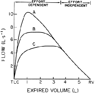 • The middle to end part of the curve is effort independent, so that better efforts do not result in very different mid- to end-expiratory flow rates. This is because the resistance in the small airways is such that greater effort cannot overcome it, and may result instead in premature closure of the airways.