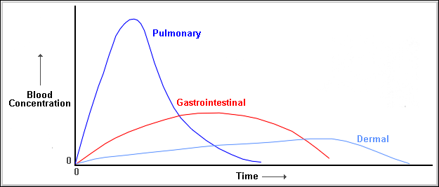 The above diagram reflects the route of maximum absorption over time showing that the most effective route of absorption is via the respiratory route, ( for particles small enough to enter the lower respiratory tract), followed by the gastrointestinal tract, with the least effective route being through the skin.