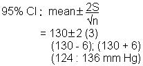 Suppose the mean systolic blood pressure among the general population is 120 (mm Hg). This value lies outside of the above 95% confidence interval (124 ; 136), suggesting that the mean systolic blood pressure among truck drivers employed in transport company "A" is significantly higher than the general population mean.