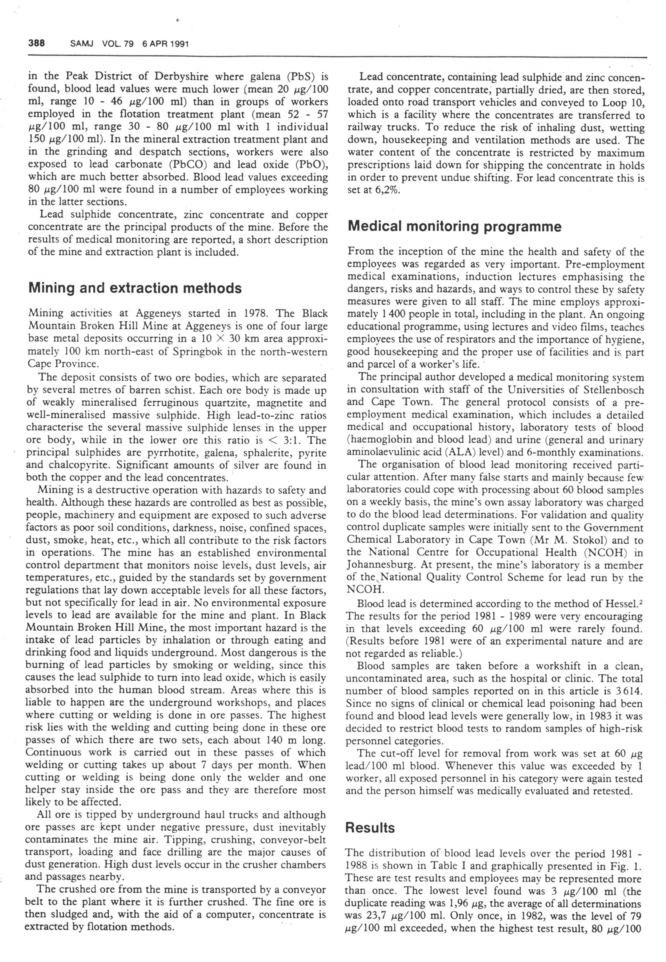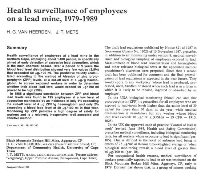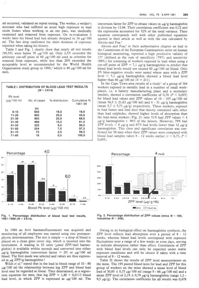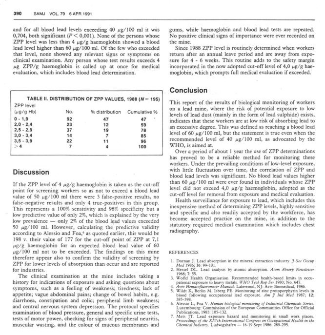 An irrelevant anecdote about an individual worker opens the results section. Only at this point is the WHO health based limit introduced although it is not called this but rather a "recommended level". The ZPP meter was only introduced in 1988 the last year of the period under study! Findings from other studies are quoted as "statements". These have low correlation coefficients (0.7) and only explain half of the variation of blood lead. Although the measure of validity sounds high the specificity is low at 79% leaving room for lots of false negatives which is a concern in a screening programme.