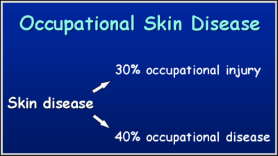 Occupational skin disease accounts for approximately 70% of skin diseases that will be noted in an occupational or work environment. Incidental conditions that do not necessarily have an occupational aetiology, such as chicken pox, account for the other 30%.