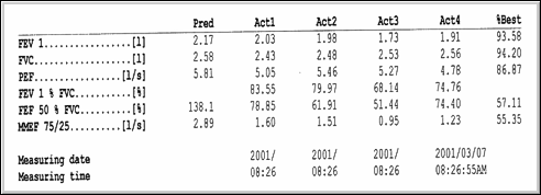 A typical spirometry report is a document which sets out, in a standard format, information gathered about a patient whose lung function has been investigated. It consists of an identifier showing the institution which performed the test, patient information, the "loop" (flow-volume curves), and a table showing the various flow-volume rates.